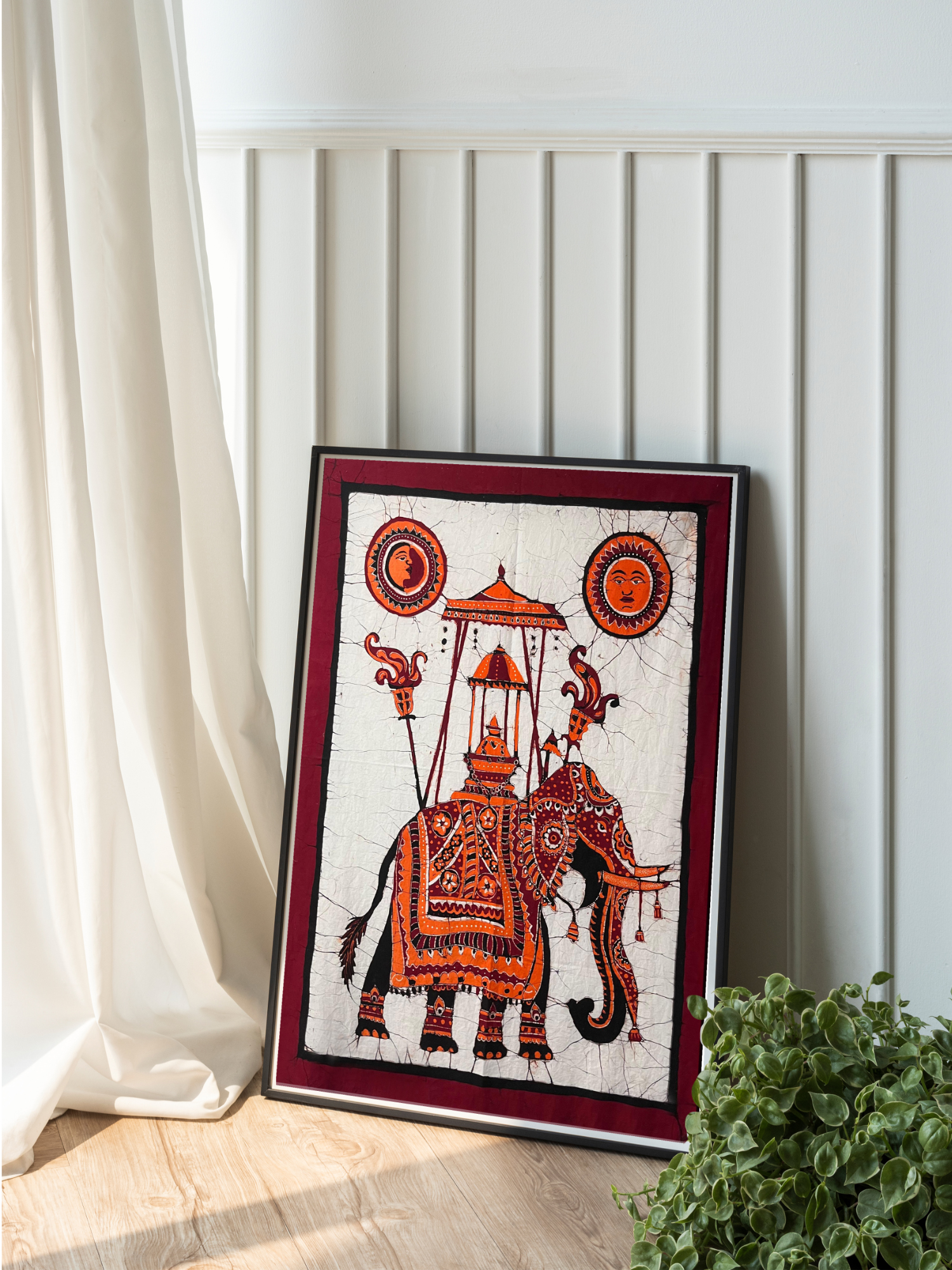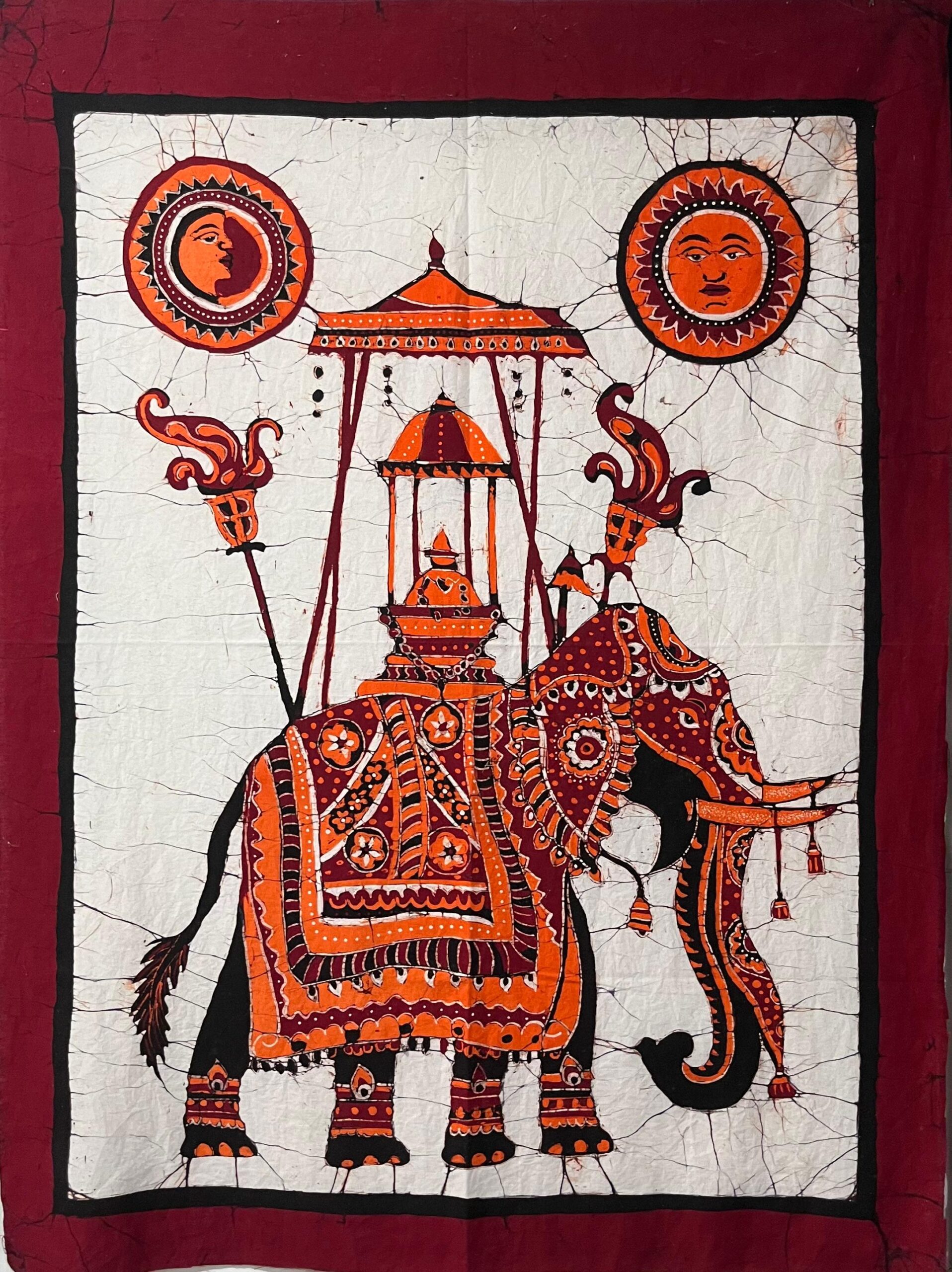- Details Celebrate the art of batik with this unique and vibrant piece, guaranteed to bring warmth and character to any space. Colors: Rich hues of orange, red, and black on a white background, framed by a deep maroon border, create a striking visual impact.