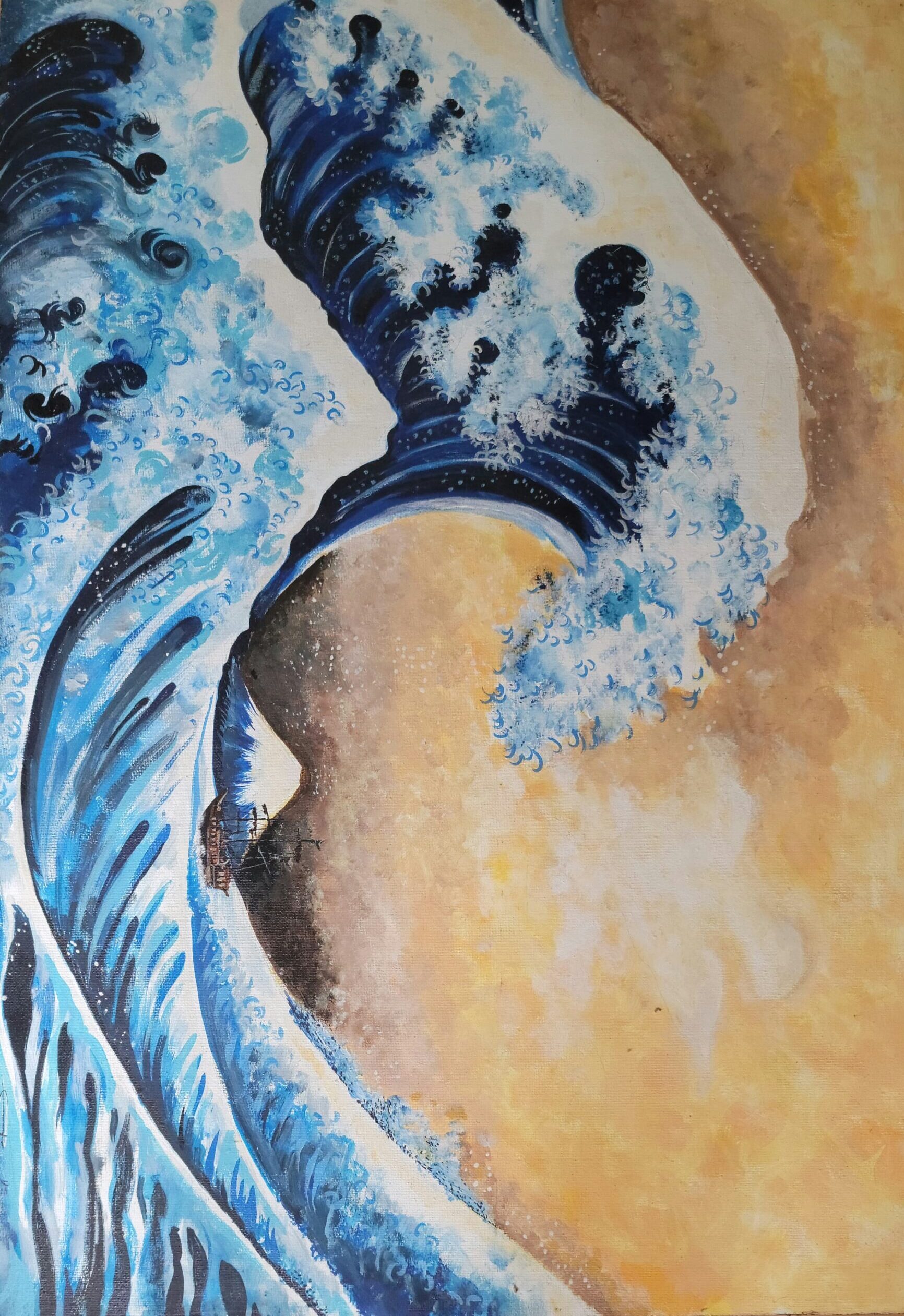 The painting depicts a dramatic wave, its frothy blue crest curling against a golden sky, with a small ship caught in the awe-inspiring scene, adding a sense of scale and adventure.